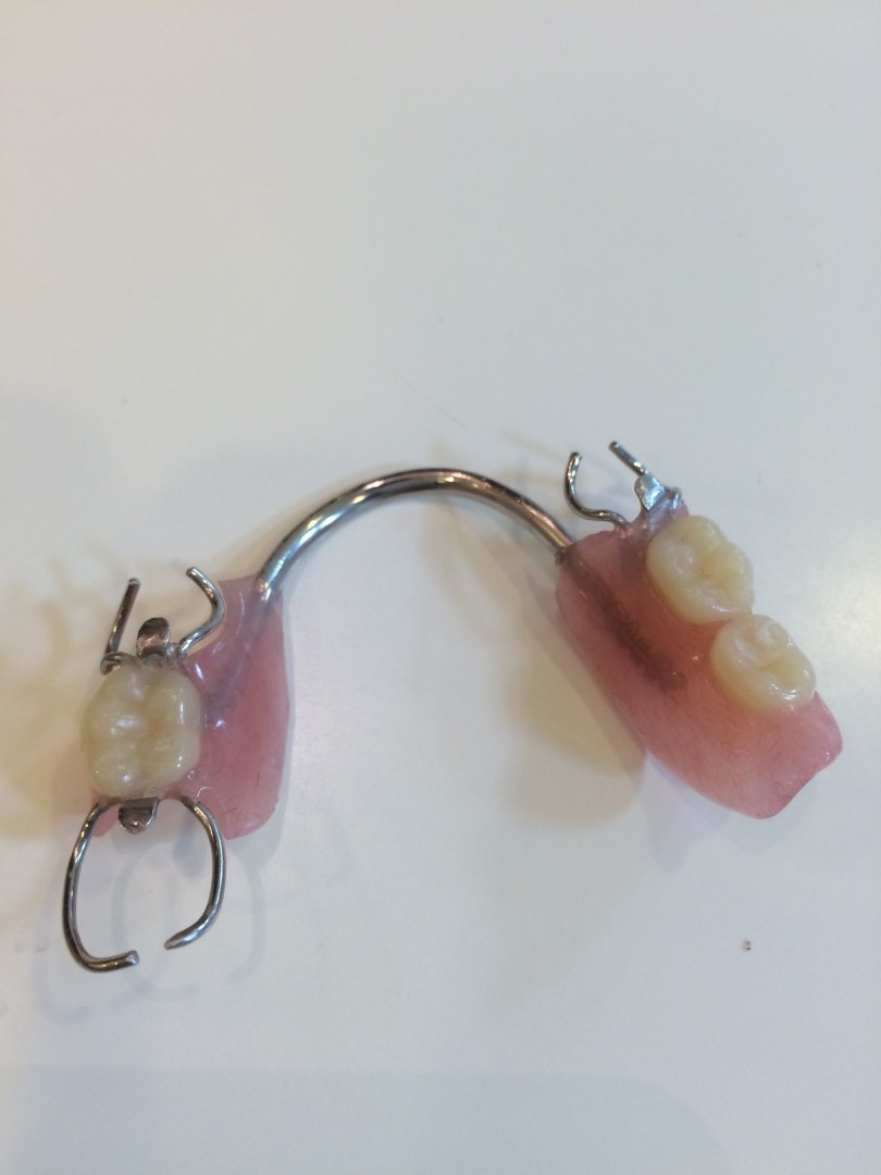 次に「ノンクラスプデンチャー」についてお話します。皆さんはノンクラスプデンチャーという言葉を耳にされたことがありますでしょうか?多くの方にとって聞きなれない言葉かと思われますが、ノンクラスプデンチャーとは、金属のバネを使わない目立たない入れ歯の総称のことを指します。入れ歯を装着した際に入れ歯が目立ってしまう原因は金属のバネにあります。多くの場合、入れ歯のバネ部分には銀色の金属が使われますので、前歯など目立つ歯の入れ歯は笑った時などに目立ってしまうことがあります。ノンクラスプデンチャーでは入れ歯を支えるために金属のバネの代わりに樹脂をつかいます。樹脂は歯ぐきと同じ色に着色しますので、笑った時にも入れ歯をしていると気づかれにくいという特徴があります。また、金属を使わないため、金属アレルギーをお持ちの方にも安心してお使いいただけます。重さも金属を使う入れ歯の役半分の重さになります。デメリットとしては、保険適用外であるために通常の入れ歯よりも費用が高くなってしまうことが挙げられます(大きさなどにもよりますがおおよそ15万円ほどです)。